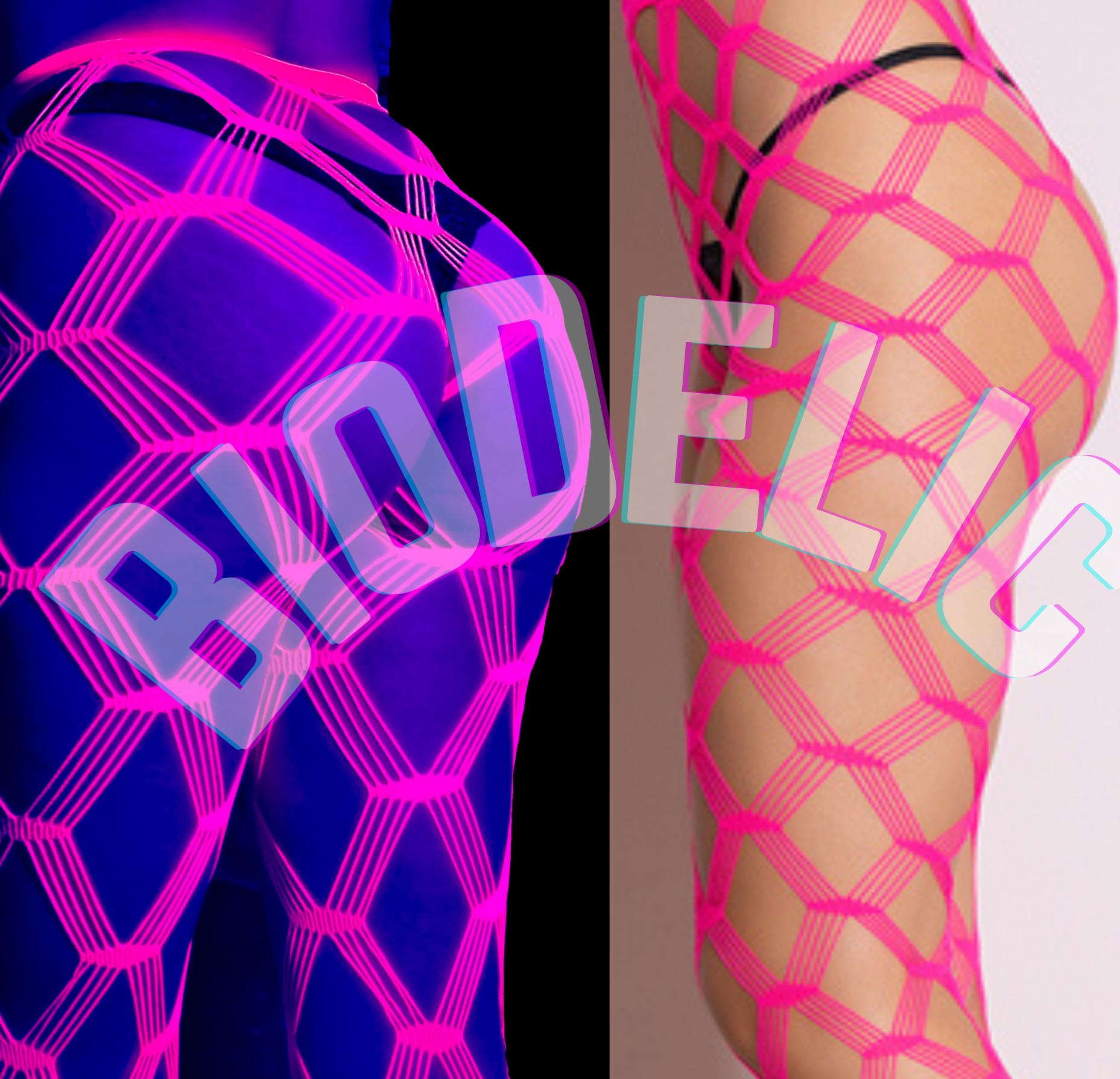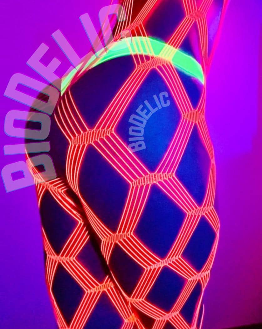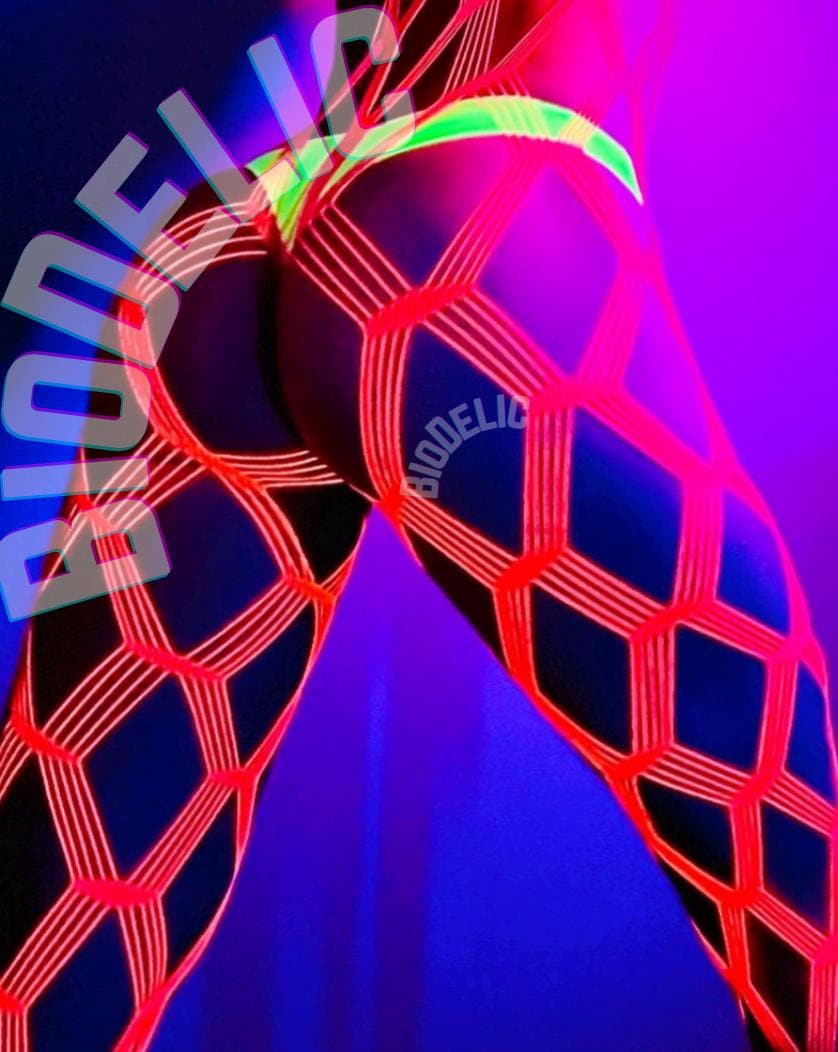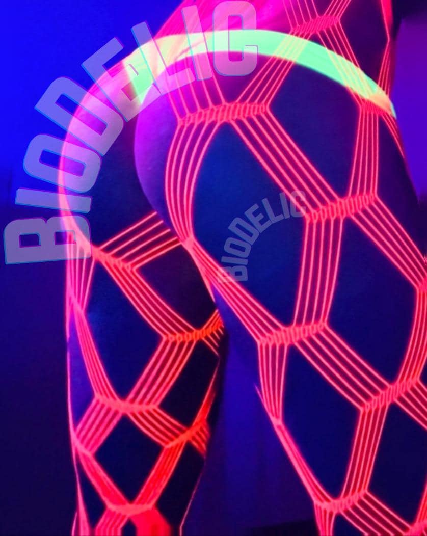 Worlds sexiest fishnet tights. Rave psychedelic uv reactive neon pink pantyhose in quad fence pattern. These beauties are one of our top sellers, they are surely to centerpiece of your outfit!