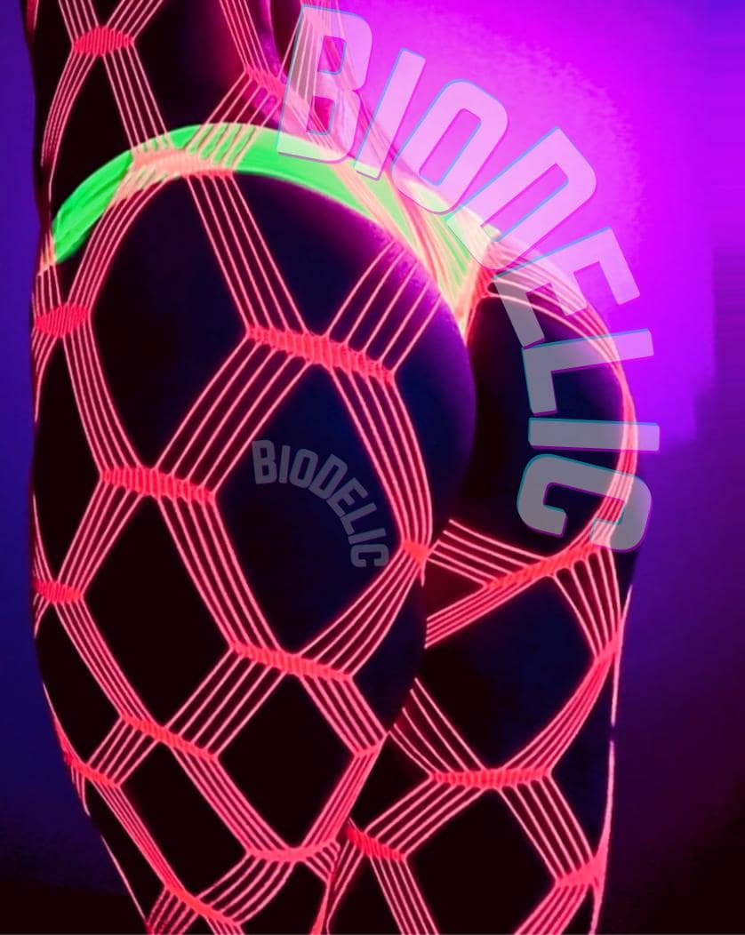 Super stretchy and comfortable, our BioDelic pieces fit and look epic on all. We use a wash-resistant, nature-based neon dye that is UV reactive, so your outfit will glow under black lights all night long!.